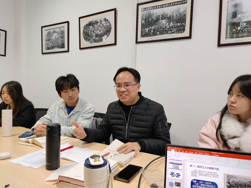 陈洁梅同学分享结束后,潘家恩教授和张斌老师进行了总结与点评,同时也引导同学们进行深入的思考讨论。潘家恩教授结合本章节的核心议题,通过“乡镇企业异军突起”、“数字游民”等话题与大家进行深入探讨,同时鼓励大家将大背景与身边小事紧密联系起来,用“宏观+微观”双视角去看问题。张斌老师分享了关于知识分子的不同观念对于历史走向的不同影响,谈到历史发展过程中人们的主观意识在历史选择中的作用。在随后讨论环节中,成员们相继从“数字游民”、“物价上涨”、“看待城乡的辩证性”等角度分享各自的见解。