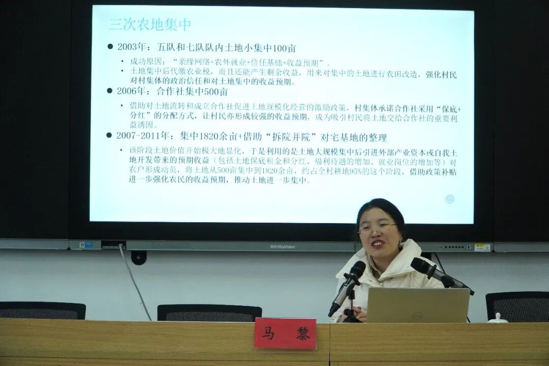研修班特别设置了 圆桌沙龙环节。《解读战旗》写作组成员西南大学张艺英老师首先梳理了战旗村集体经济发展历程和关键经验、四川师范大学马黎老师梳理了战旗村土地整合的不同方式,随后和学员们深度交流,学员们结合自身所在地的实际情况,围绕“集体经济如何有效联结农民”、“资源盘活与业态创新”、“党建引领与治理协同”等议题展开热烈讨论。最后,两位老师做了总结发言。