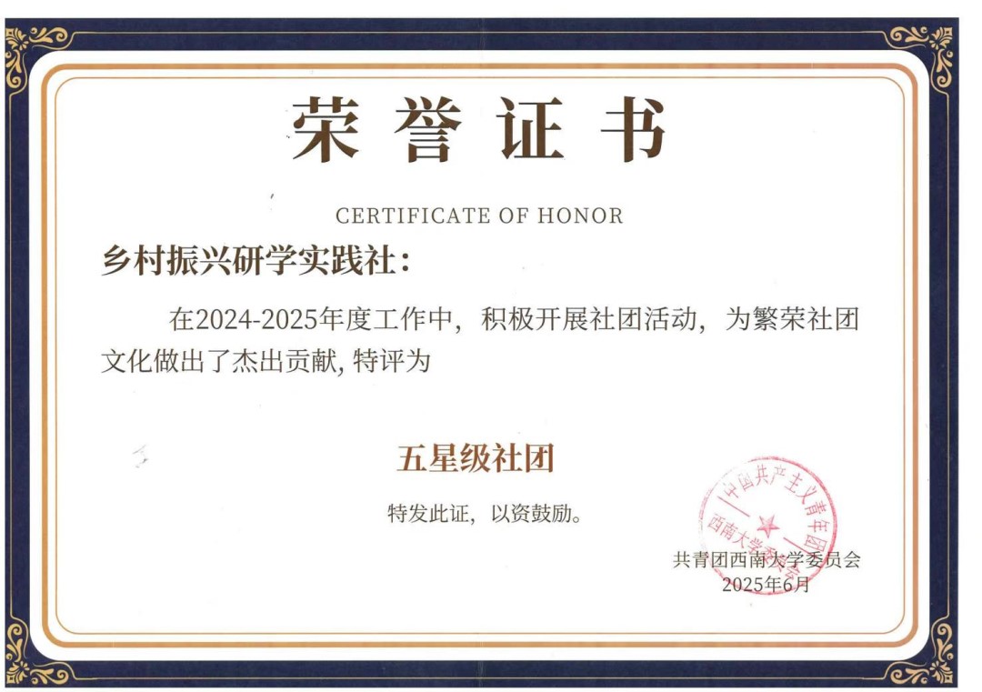 因卓越的活动成效、规范的组织管理与广泛的社会影响力,我们被学校认证为五星级社团!我们立足校园,走向田野,聚焦乡村振兴国家战略,通过学术研究、社会实践、技术创新、文化宣传等方式,深入乡村一线,为乡村振兴贡献青春力量。