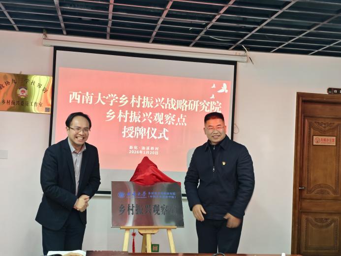 20日下午,西南大学乡村振兴战略研究院在油溪桥村举行了“乡村振兴观察点”授牌仪式。我院副院长潘家恩教授与油溪桥村党委书记彭育晚共同为观察点揭牌。该观察点的设立,旨在系统研究、总结与推广油溪桥村以“积分制”为核心的基层治理与乡村振兴实践,为全国乡村振兴提供可借鉴的学术样本与实践经验。