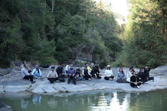 来到溪水边平坦处,袁宏老师在此带领大家静坐,流水淙淙,声声作响。闭上眼,安静下来时,可以听到山里的鸟鸣,水的流淌声,以及自己的呼吸声,万物仿佛都宁静了。
