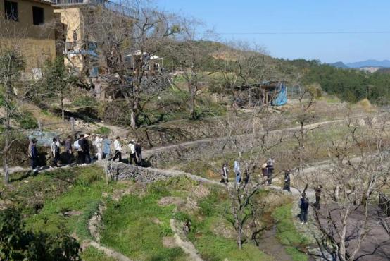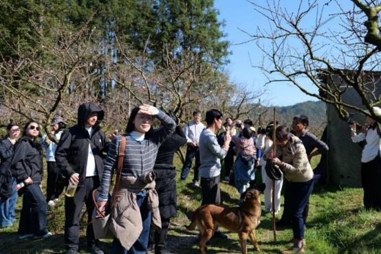 沿路会经过很多景致,最开始的一个停留点是新村民大海的桃花林。这个时节,桃树上刚开始结花骨朵,零星的花朵在阳光下绽放出淡粉。大海给大家分享他如何来到村里,酿造黄酒,养护桃树。
