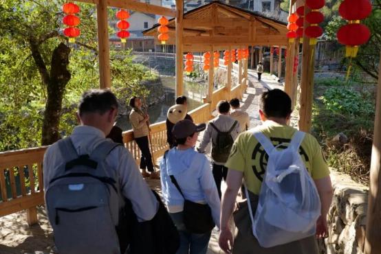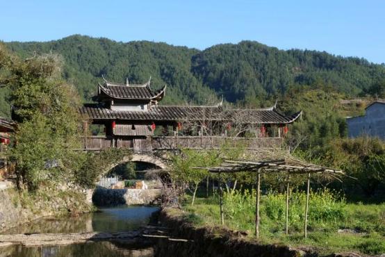 最后再经过一段路,远远可以看到龙潭附近的水塘,过了这一段,便抵达了龙潭雨廊,雨廊对面,是古朴的廊桥,廊桥一头连着山野的寂静,穿越了数百年的风雨,一头连着木质雨廊,熏染着新老村民的烟火气息。