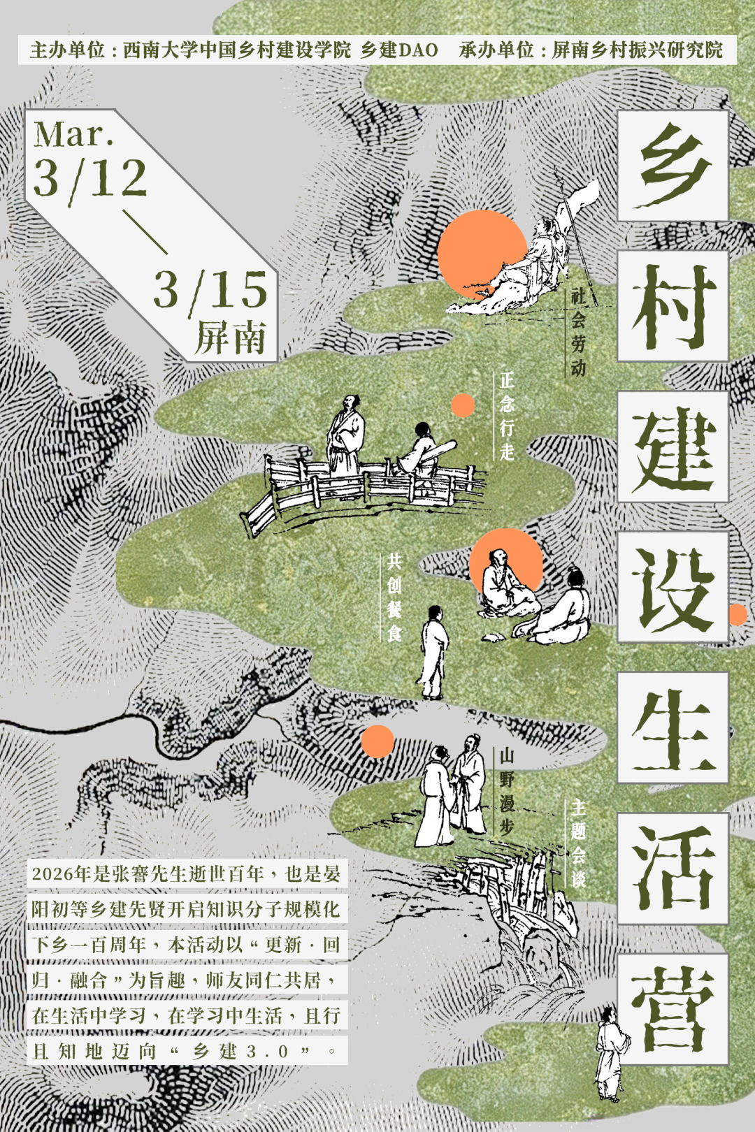 23年过去,乡村建设进入新阶段,面对新的外部环境,危机与挑战并存。2026年是张謇先生逝世百年,也是晏阳初等乡建先贤开启知识分子规模化下乡一百周年。值此之际,我们希望重续“草场地”传统,以“更新·回归·融合”为旨趣,师友同仁共居共学,在生活中学习,在学习中生活,且行且知,迈向“乡建3.0”。