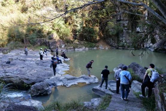 接下来,我们走过桃林附近的下坡,过一段幽静的小道,小道旁发现被村民供奉的小庙,继续往前岔路口处下行,便是一汪清澈的潭水。小瀑布从乱石处冲击而下,然后汇聚在一起形成水潭,十分清凉。